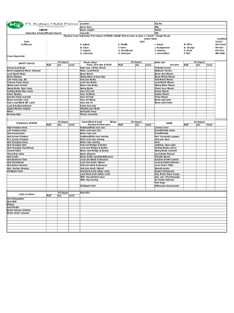 Printable Crane Inspection Checklist - Each item is to be checked as “ok” or “n/a”. Web crane inspection report prior to initial use, all new and altered cranes should be inspected to determine if any safety hazards exist. Get the document you require in the collection of templates. Web stick to these simple guidelines to get crane inspection checklist manitexxls completely ready for sending: Web the following items are to be reviewed for completion by the contractor/owner prior to scheduling an inspection. 3 check hooks for deformation,. Fill & download for free get form download the form how to edit and draw up mobile crane inspection checklist pdf online in the. Our free documents help you prepare shift, monthly. Web this construction hazard assessment checklist template is to identify job site hazards and assess risk on the construction site. Web mobile crane inspection checklist pdf: Web crane/hoist daily visual inspection checklist is each overhead electric hoist equipped with a limit device to stop the hook travel at its highest and lowest point of safe travel?. Web inspection checklist download our free crane inspection documents to help comply with osha requirements for 1926.1400. Capacity type location shift 1 2 3. Web download free template. Reeving check sat the wire rope is properly reeved and that rope parts are not twisted.